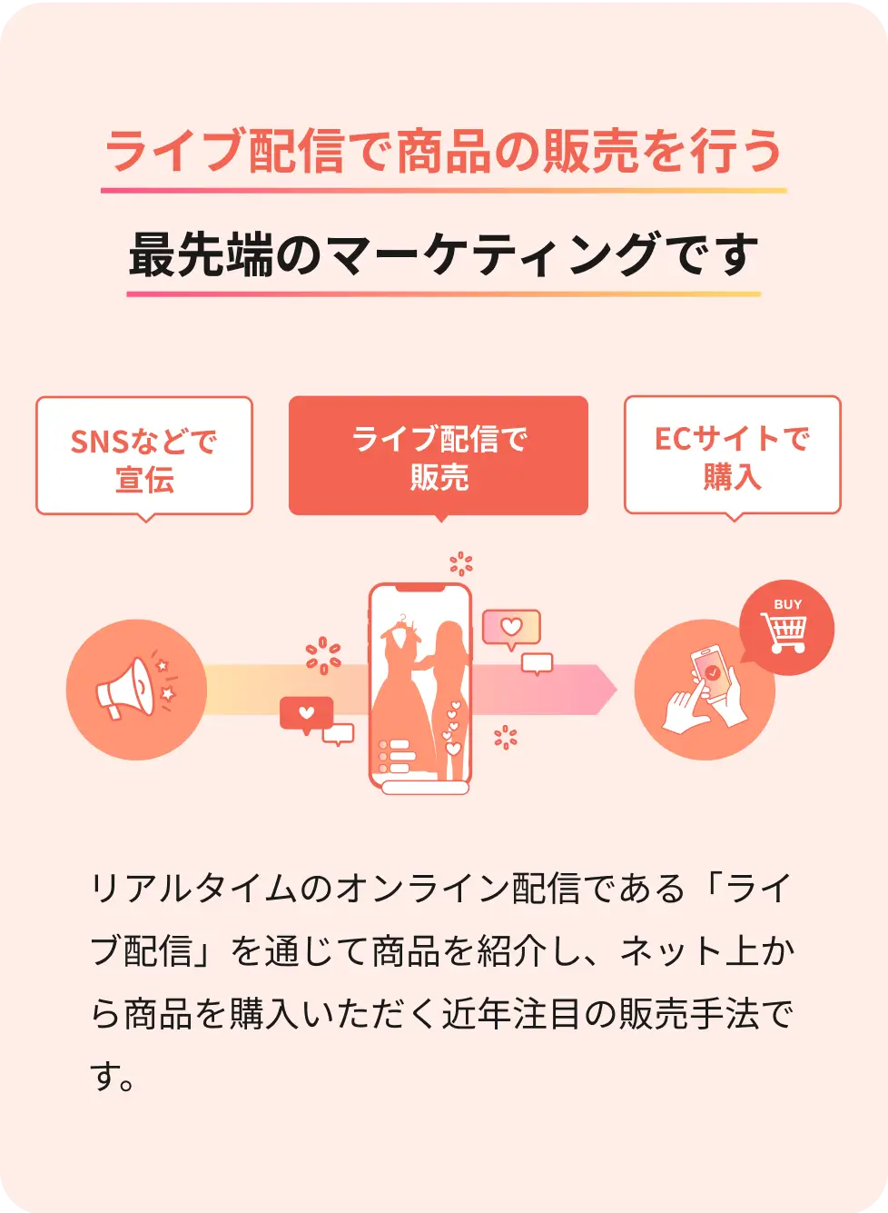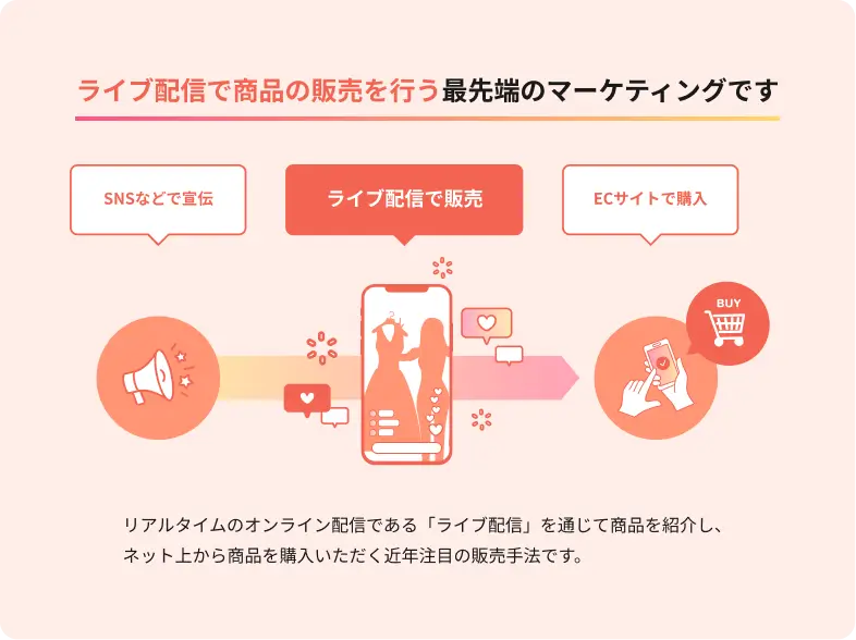 ECサイトでの販売に比べ、「リアルタイムであること」「情報量が多いこと」「双方向でコミュニケーションが取れること」などで販促力が高い傾向にあります。またインフルエンサーとコラボしやすいなどPRの効果もあります。